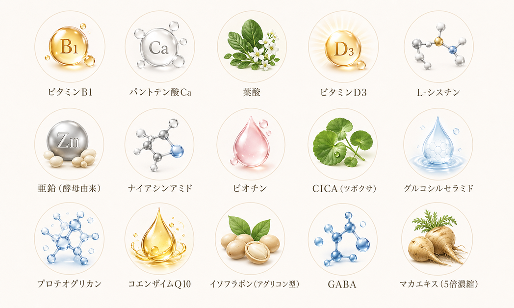 ビタミンB1、パントテン酸Ca、葉酸、ビタミンD3、L-シスチン、亜鉛(酵母由来)、ナイアシンアミド、ビオチン、CICA(ツボクサ)、グルコシルセラミド、プロテオグリカン、コエンザイムQ10、イソフラボン(アグリコン型)、GABA、マカエキス(5倍濃縮)